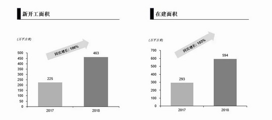 2018年,花樣年通過周轉(zhuǎn)提速,年內(nèi)工程面積大幅增長,新開工面積和在建面積均增長超過1倍,其中新開工面積達到463萬平方米,在建面積594萬平方米,確保公司2019年可售資源充裕。